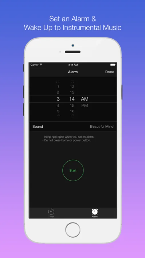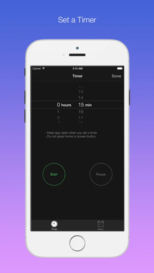 Note: In order for the timer or Alarm to run properly, the app must remain open. Do not press the home or power button. If you want your screen to turn off, just place your iPhone face down.