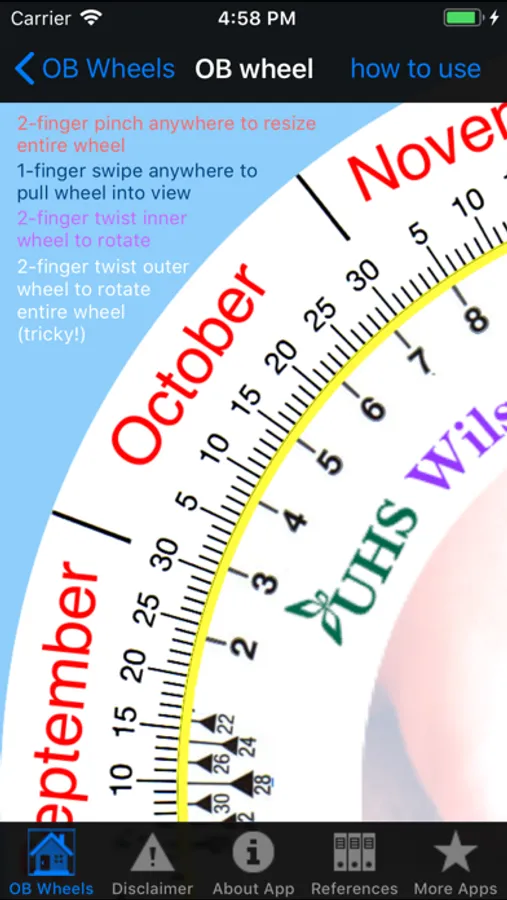 Then for all of you who miss your cardboard OB wheel, the app contains one which you can rotate, pinch and zoom, and generally play with just like a regular cardboard wheel. It's a little tricky to learn how to plant two fingers and rotate them rather than pinch-and-zoom to get rotation versus resizing. But the wheel works and it is accurate, especially so because you can zoom in to be sure where the little date hash lines lie.