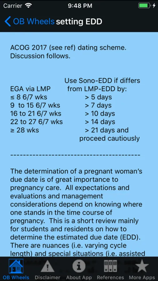 Finally, the app notes the most recent committee opinion scheme from ACOG on how one might reconcile due dates from LMP and sonograms to arrive at a single final EDD. To my knowledge, the scheme is authority-based and no better or worse than other schemes, but my practice and my learners need a single clear scheme, so this app includes one for easy reference.