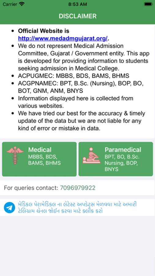 This App gives complete information of MedicalParamedical Admission 2023 like, Medical (M.B.B.S.), Dental (B.D.S.), Ayurvedic (B.A.M.S.), Physiotherapy (B.P.T.), Homeopathy (B.H.M.S.), Nursing (B.Sc.), Orthotics (B.P.O.), Optometry (B.O.), Naturopathy (B. NAT), Audiology(B.A.S.L.P.) Courses in Government, Municipal, Grant-In-Aid and Self Financed Colleges in the state of Gujarat after qualifying examination (Group B or Group AB) and GUJCET.