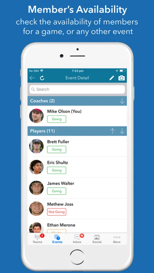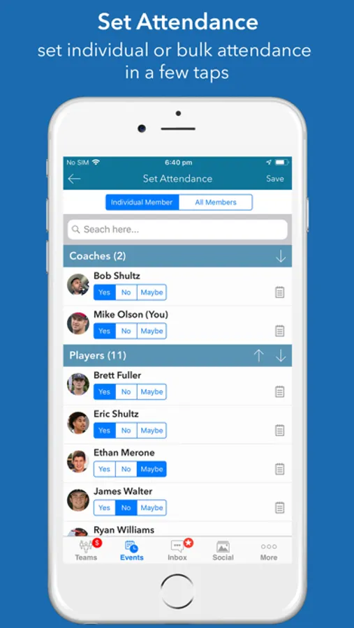 • Attendance and player availability: Team members or parents can set their availability for upcoming events. Coaches can mark member attendance as present or absent for the events.