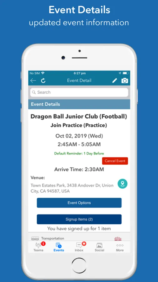 • Carpool: Team admins can easily check who needs a ride, who is driving and arrange carpool. Coaches can also add transportation for games or events.