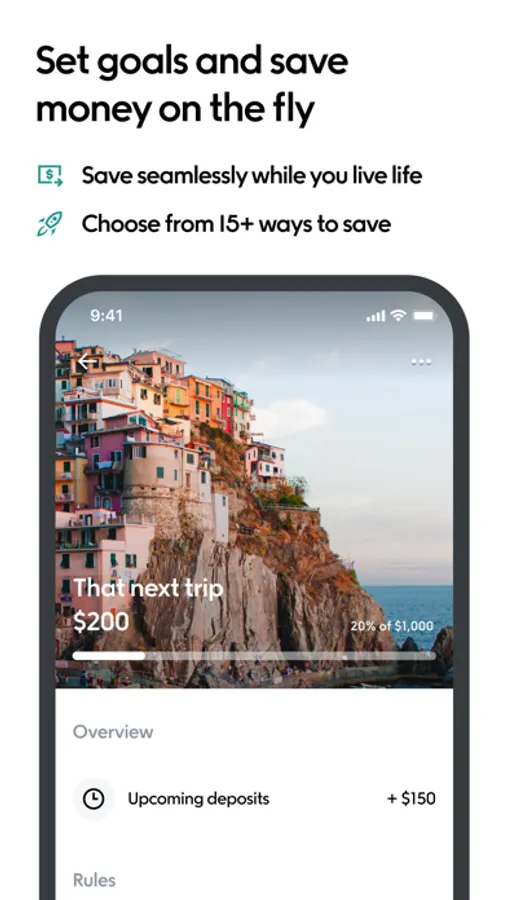 Smarter saving: Set your savings Goals then use our smart Rules to save toward them automatically. And use our integration with the Apple Health app to save money toward your Goals when you reach your target for Walk or Run Distance, Steps, or Workouts. You can also customize your own Rules with our IFTTT integration (we have a few to get you started). All FDIC-insured up to $250,000.