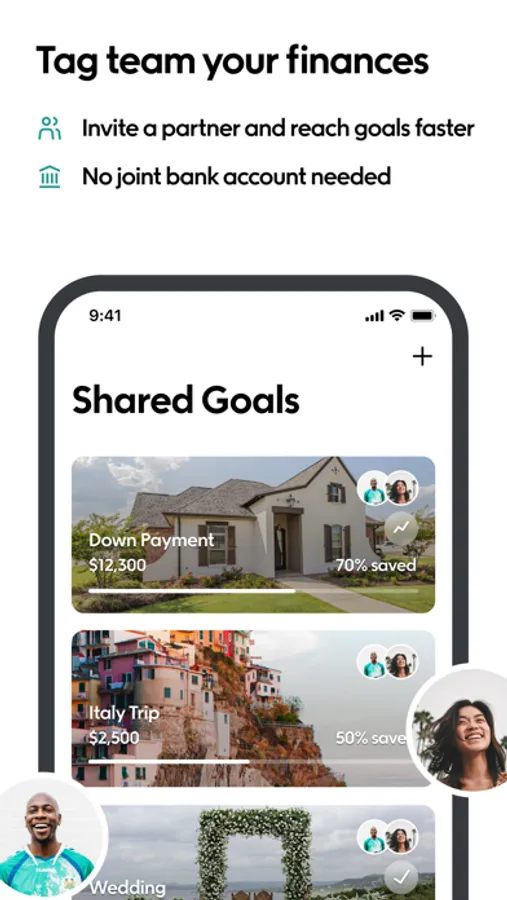 Smarter shared finances: Designed for the way couples manage money together today, Qapital Dream TeamTM lets you save toward shared Goals and see one another’s transactions without giving up your individual accounts.