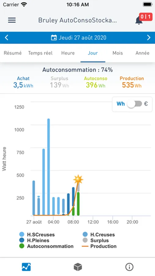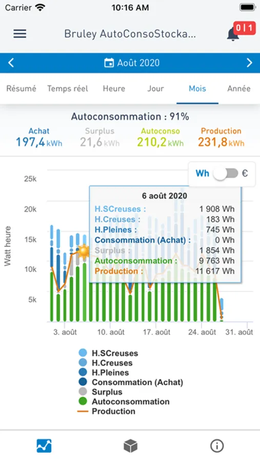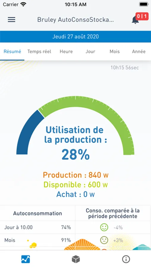 - Visualisez la consommation et la production en temps réel, en kWh et en Euros grâce à des graphiques clairs et pensés pour tous.