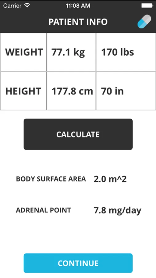 2) Calculates body surface area to determine at what dose taper should be slowed down due to potential adrenal insufficiency (“adrenal point”).