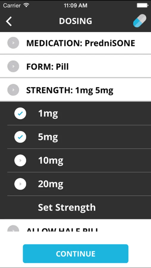 6) Allows user to select up to two pill strengths of prednisone per taper.