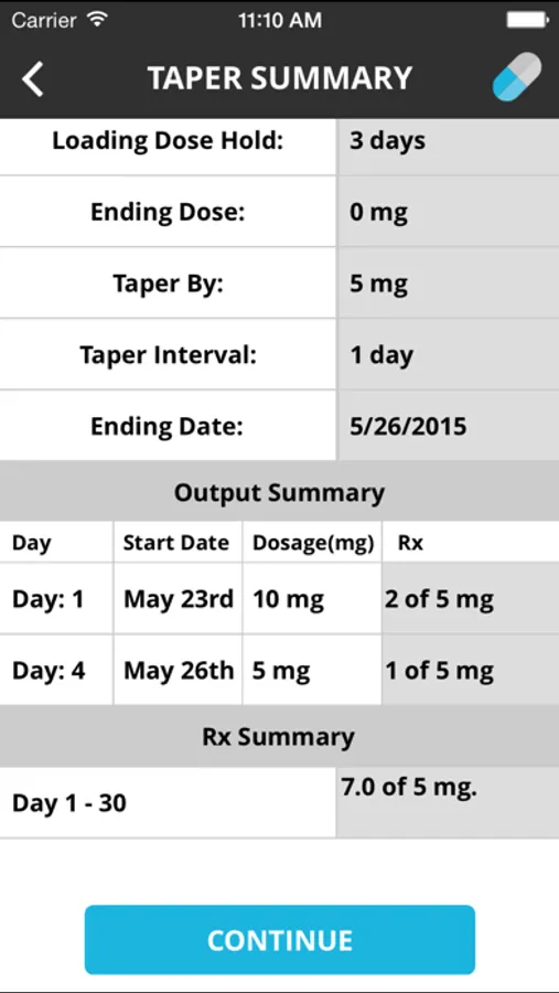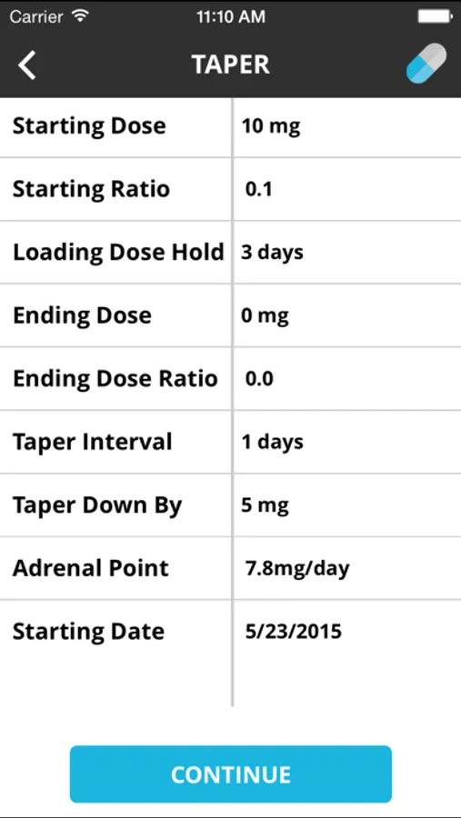 5) When calculating a taper by a fixed percentage, if the App calculates that the dose will repeat for two consecutive taper periods, the App will terminate the taper after the first of the duplicate taper periods.