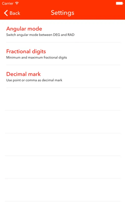 SETTINGS: Angular mode, Fractional digits, Decimal mark