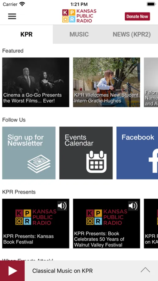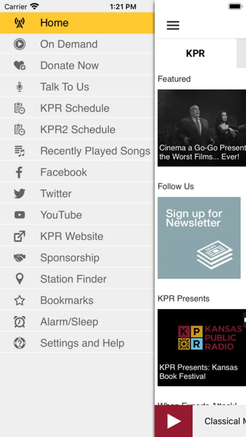 The Kansas Public Radio App allows you to listen to KPR live, pause and rewind the live audio, and view the KPR program schedules! You can explore On Demand content, search for stories, bookmark a story for later, and wake up to KPR with the alarm clock!