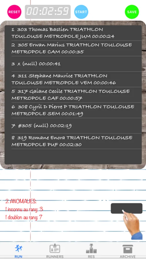 Dans les deux cas (avec ou sans listing de coureurs), il est possible de corriger des erreurs de saisie. Les anomalies telles que "numéro inconnu" (x si "Enter" a été tapé sans numéro de coureur, x+numéro si le numéro de dossard n'est pas dans le listing considéré ou n'est pas un nombre entier compris entre 1 et 1000), ou "doublon"(#+numéro si le numéro a déjà été saisi) sont tracées. On peut à la fin de la saisie ou entre deux saisies modifier un numéro de dossard, le temps, inverser deux coureurs, insérer un coureur ou en supprimer un de la liste des arrivées.