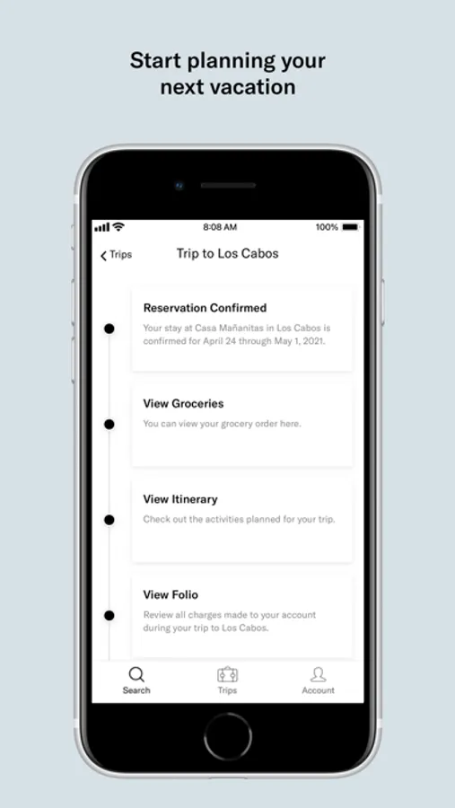 View your existing reservations and trip itineraries. Add trip companions, order groceries, and review your folio. On-demand access to your Care team at the touch of your phone. Share your experience with fellow Inspirato members by writing reviews.