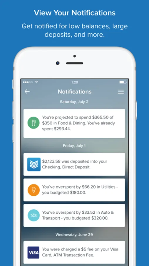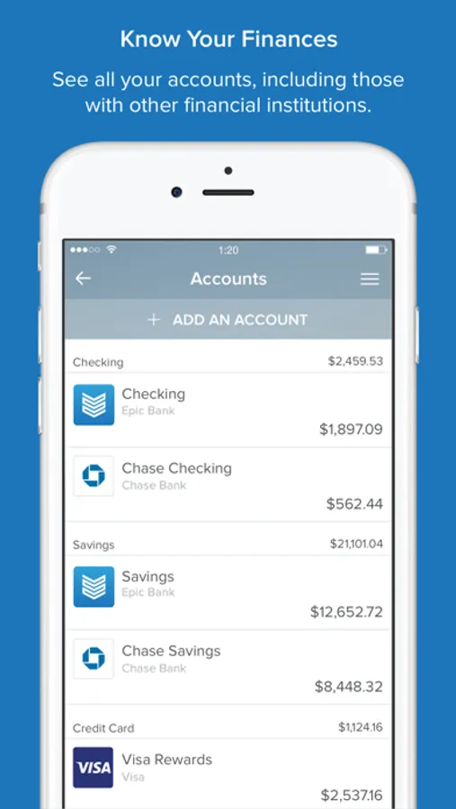 Epic Bank’s award winning design makes managing money not only easier and more convenient - but a lot more enjoyable and exciting as well. Not only will you be able to see all your financial data in one place, you will be able to visualize that data in meaningful and engaging ways on your device.
