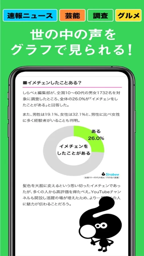テレビやネットをゆっくり見られない方も、しらべぇを読んでおけば、「今話題になっていること」はだいたい押さえておくことが可能。話題の新商品の体験取材も充実しているので、トレンドを知っておくことにもつながります。