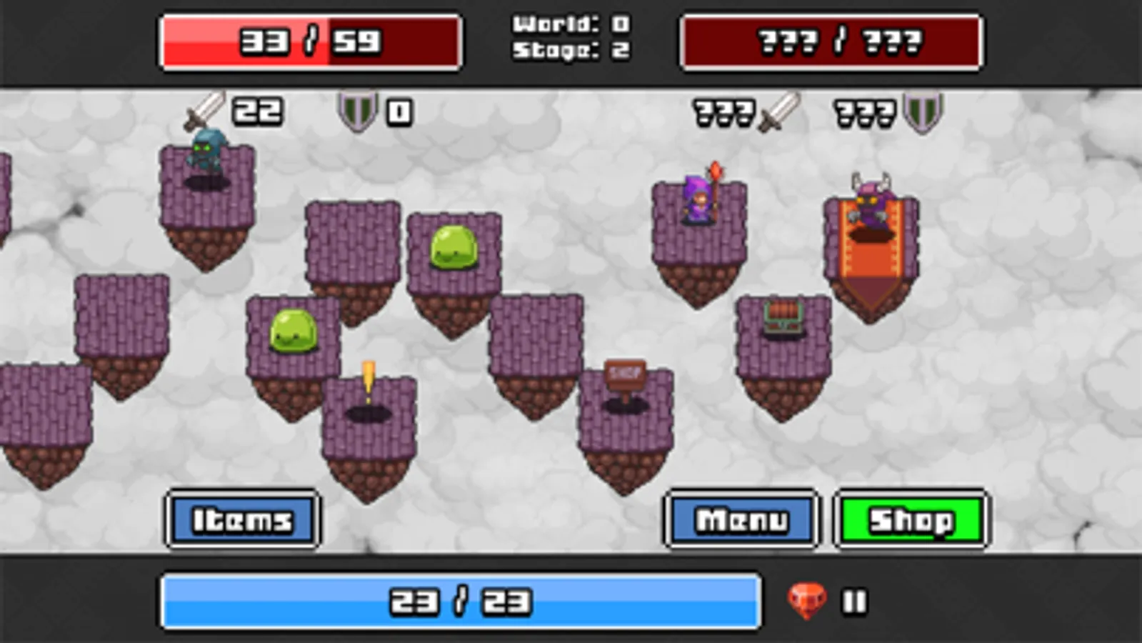 Unlimited worlds with randomly generated encounters, treasure and paths to discover. Power towards victory by defeating foes and spending your hard earned spoils playing games of chance.