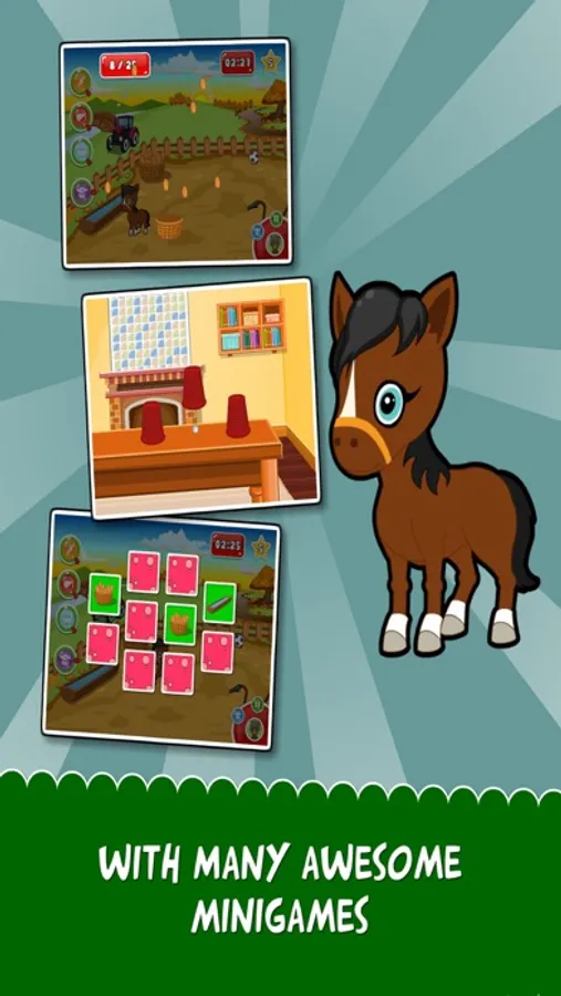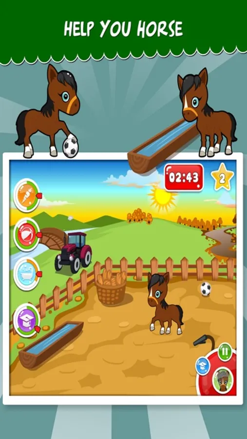 In this animal game horse Flora is starring. In level one she's a little filly. You have to take care of her so he grows and can be strong. In the second level Flora's big and strong. She wants to learn a lot and is loyal to you. Train her and participate in matches, where you'll win if you've trained Flora well. In the third level the horse is old. Take good care of this old cute horse.
