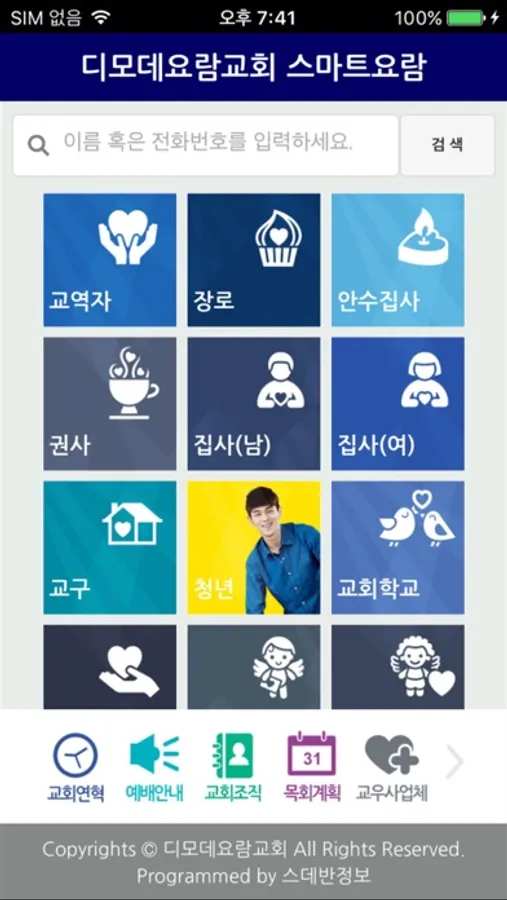 교역자, 장로, 권사, 집사 및 구역장(목자), 교사 등 모든 성도들의 요람을 스마트폰에서 확인하실 수 있는 스마트폰용 어플리케이션입니다.