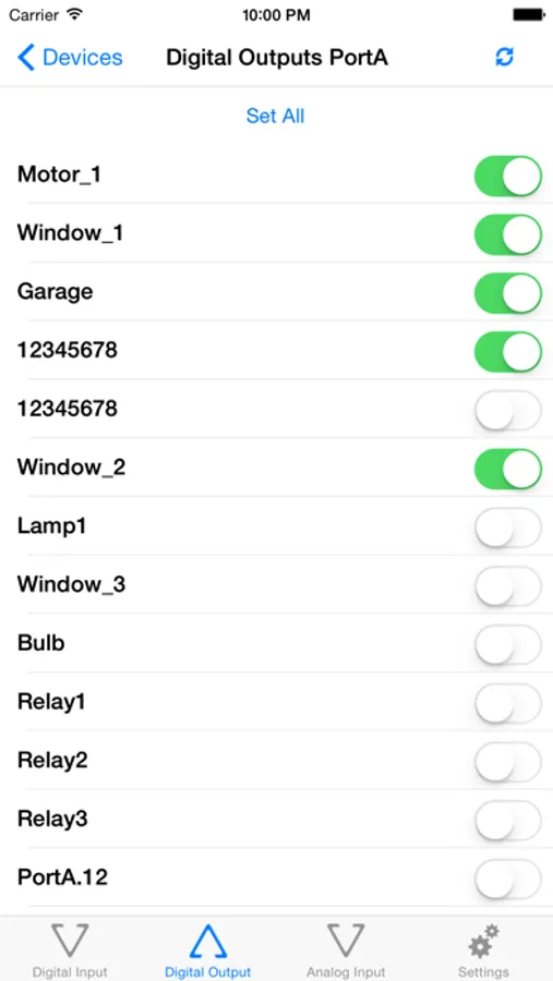 Manual or auto refresh of the digital inputs values. Usually these inputs have two possible states - ON and OFF which are shown in the application with different colors. Additionally some modules support counters for the digital inputs which will be also shown on the same screen.