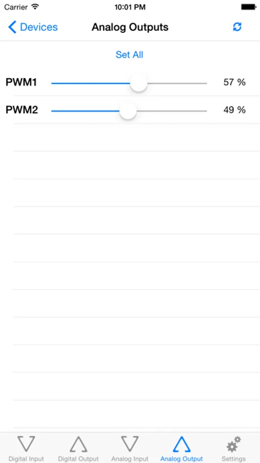 This tab is for devices which support Analog Outputs (PWM). The sliders can be easily used for dimming lights for instance in your home.