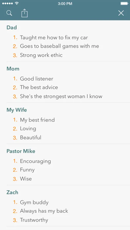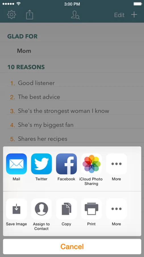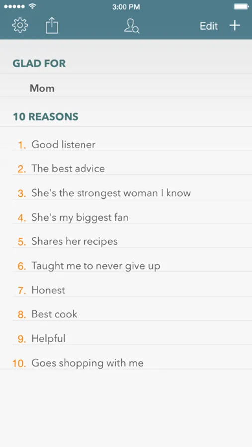 Introducing 10 Reasons for iOS, a sister app to Wants & Thanks. 10 Reasons is a simple and elegant way to express gratitude for the people and things in your life. Enter the name of someone or something you're grateful for and up to 10 reasons you appreciate them. Keep it private or send your list to that person as an image, text, or PDF. Sharing options include social media like twitter and Facebook, email, and text.