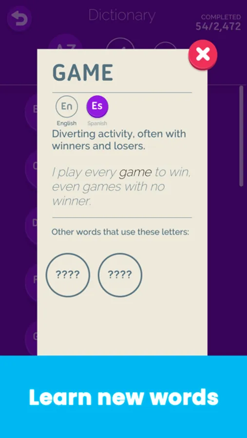 The Dictionary screen makes it easy to learn new words and improve your language skills. Compete with your friends to be at the top of the leaderboards and be the Four Letters champion! If you are looking for that personal challenge, there are lots of different achievements to work through to track your progress.