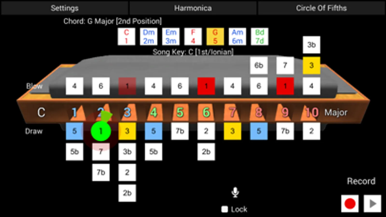 Circle of Fifths mode is an interactive Circle of Fifth’s specially adapted for harmonica. The Circle of Fifth’s is a well known music theory tool for working out chord and scale relationships.