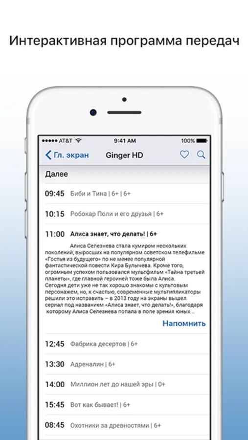 Планируйте просмотр — в приложении доступна программа передач для телеканала с возможностью установить напоминание о просмотре.