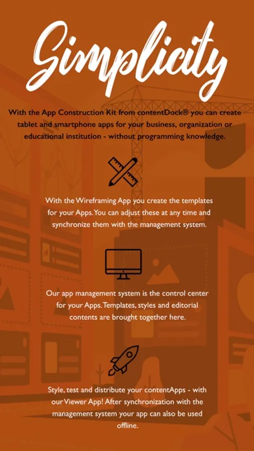 With the contentDock® service, you can simply build and develop individual NATIVE iPad and iPhone apps for your company, organization or educational institution - without any programming knowledge.