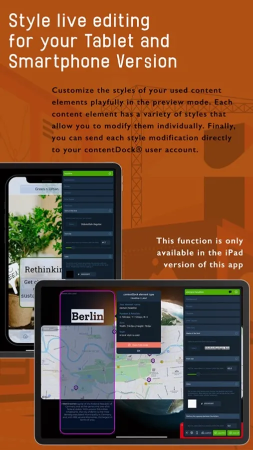 With the contentDock® Viewer App you accompany the implementation of your apps. Style your content elements intuitively with the Style live editing system and test your app as you like. Without third parties having access - very uncomplicated in preview mode!