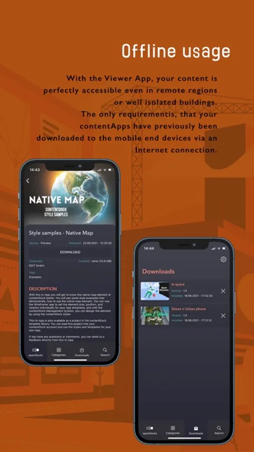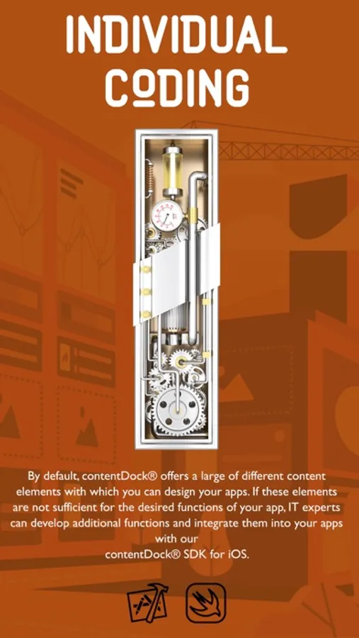 contentDock® standardly provides a large catalog of different content elements with which you can design your apps. If these elements are not sufficient for the required content or function of your app, IT experts can simply develop additional native functions with the contentDock® SDK and Objective-C, Swift or SwiftUI.