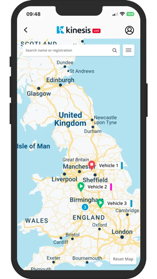 The Kinesis app offers a streamlined version of the full system, showing a live map of all vehicles.