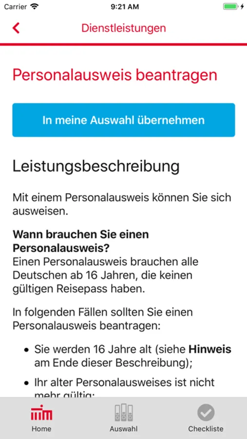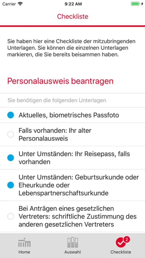 Haben Sie eine gewünschte Dienstleistung und den zuständigen Standort gefunden, können Sie diese Auswahl speichern. In einer Checkliste erhalten Sie einen Überblick, welche Unterlagen für Ihre ausgewählten Dienstleistungen noch benötigt werden.