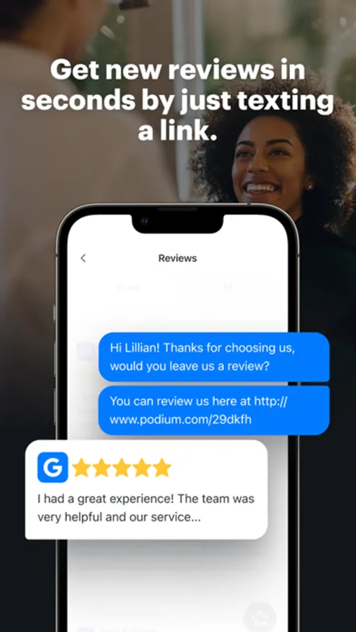 - Reviews: Double your monthly review volume in less than 60 days and increase website and foot traffic to your business by sending review invitations via text through Podium.