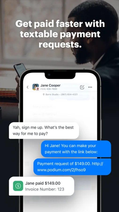 - Payments: Get paid with just a text. Payments through Podium gather more reviews, generate higher quality leads, and centralize your customer data to communicate and market in a more targeted way.