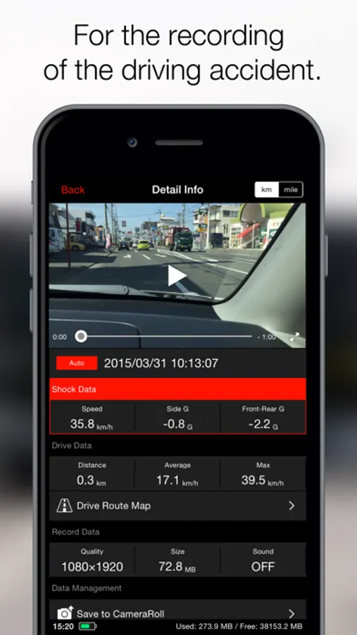 This App can sense the shock during the drive by using the acceleration sensor of iPhone. And that record one minute before and after the shock.