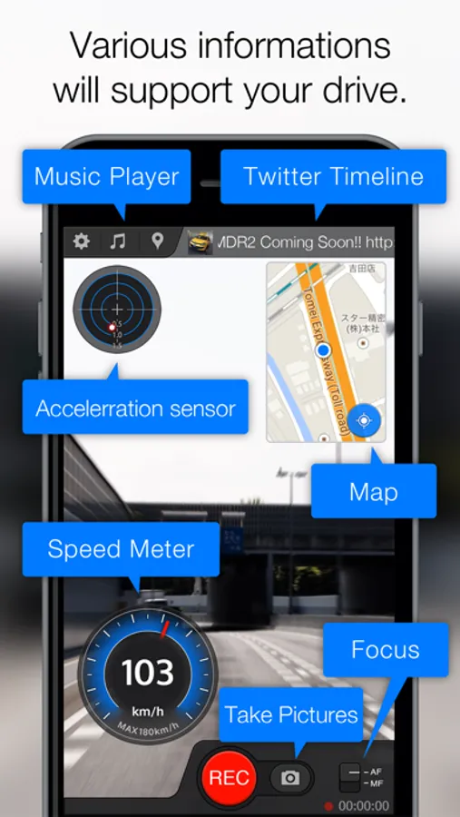 Map, Speed Meter, Acceleration Sensor, and TwitterTimeline are shown on the recording screen. They will support your drive.