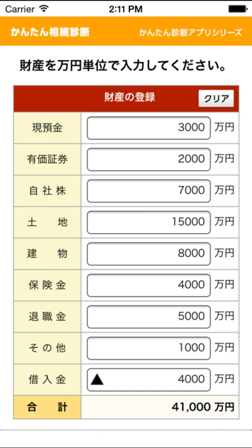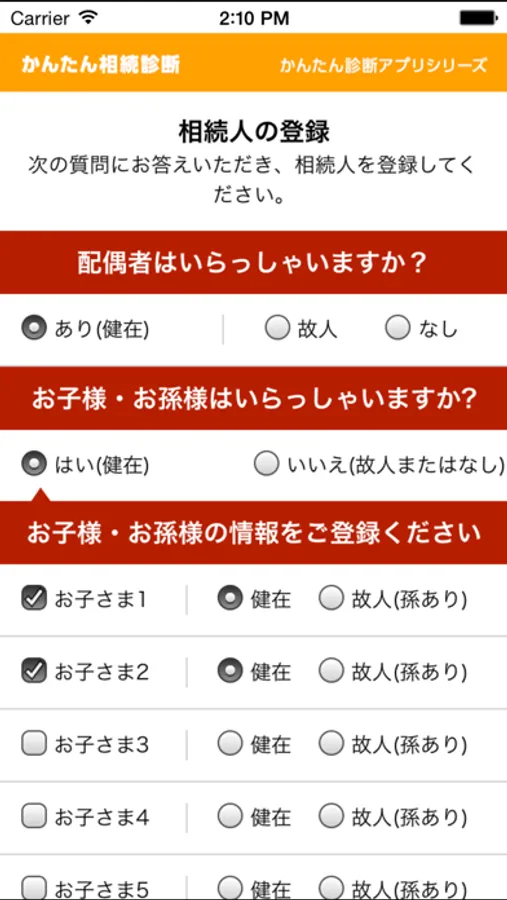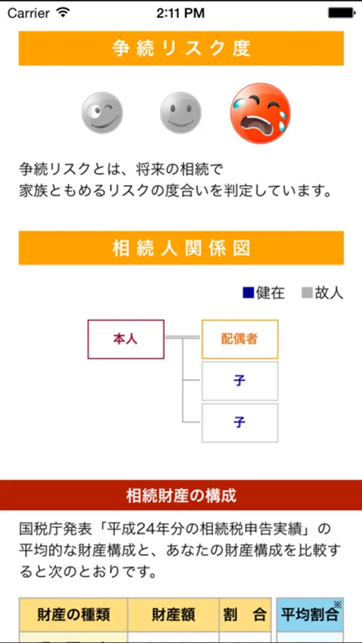 英和コンサルティングの「かんたん相続診断」は、英和税理士法人が監修し2015年度の税制改正に対応した相続税額を試算するのと合わせて、現状の総合診断を5段階で、納税力と争続リスクを3段階で診断するアプリです。