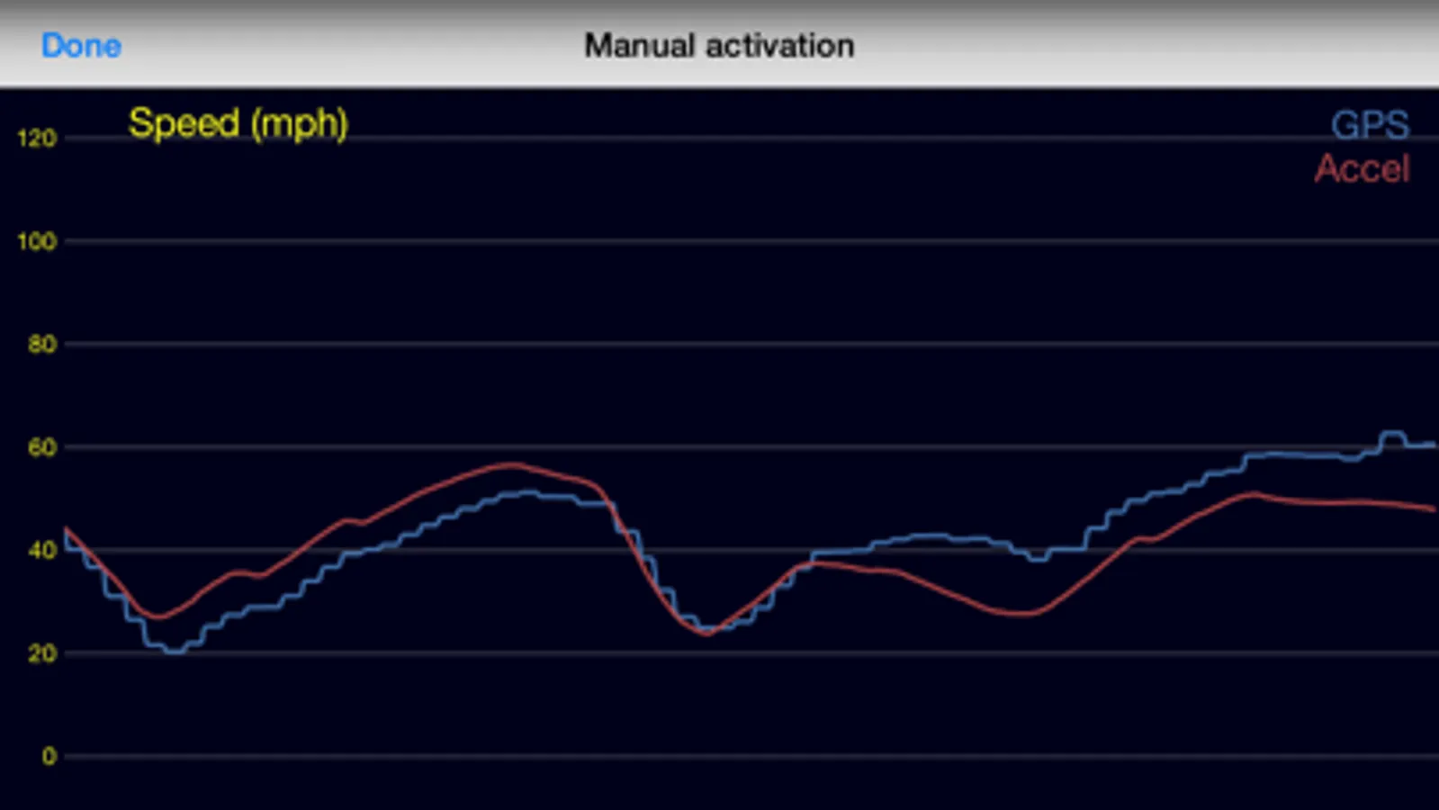 * Please note that if your phone is not positioned in the car with the long edge perpendicular to the direction of travel, or if you don't set the phone by pressing the Reset button, the accelerometer based speed trace is unlikely to match the GPS speed. The Auto-level feature built into the app will attempt to correct for any mismatch but it will work far more effectively if the phone is positioned correctly. Testing on this and other IDR devices has also shown that the GPS speed trace tends to lag the actual speed of the vehicle by about 0.5 to 1.0 seconds.