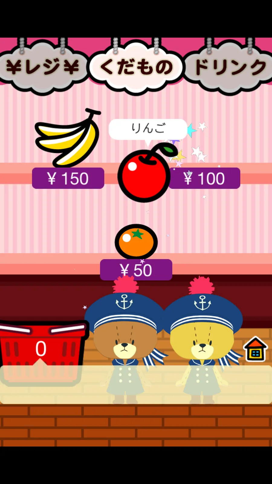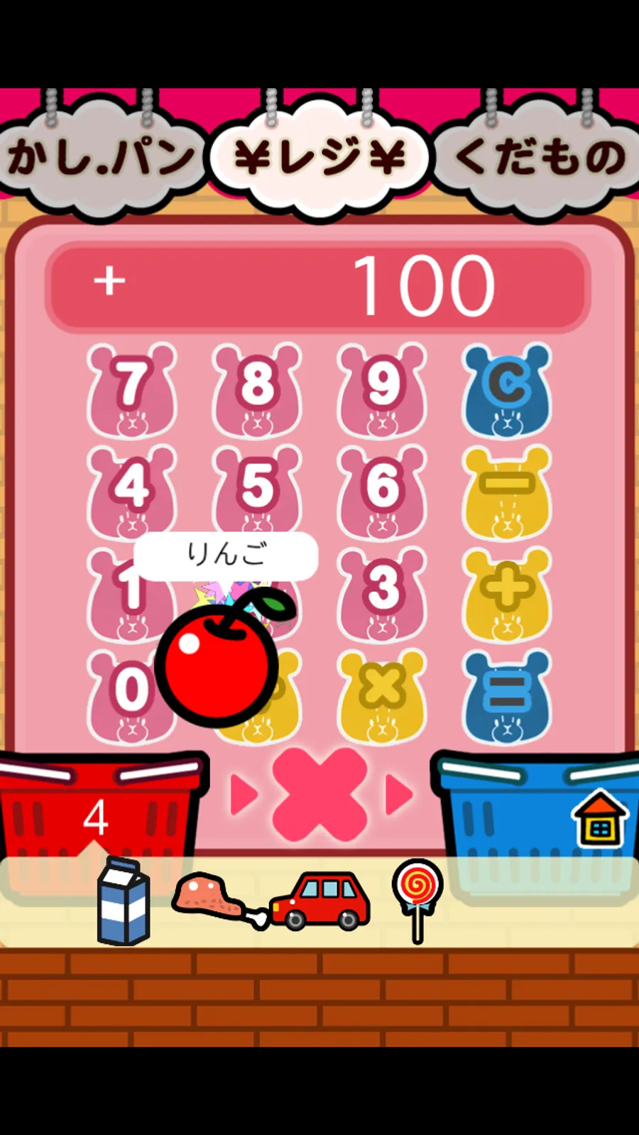 レジの商品をセンサーにドラッグ、「ピッ!」と通してお店やさん気分。レジ画面では電卓と同じように計算も出来ます。