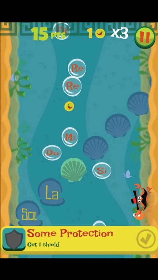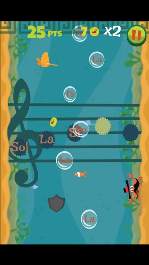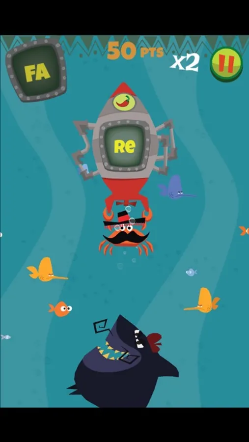 By helping Chili Crab escape from Le Shark, the sinister french shark, your child will have a first contact with the names of the musical notes and their ascending (do - re - mi - fa - sol - la - si) and descending (do - si - la - sol - fa - mi - re) sequences.