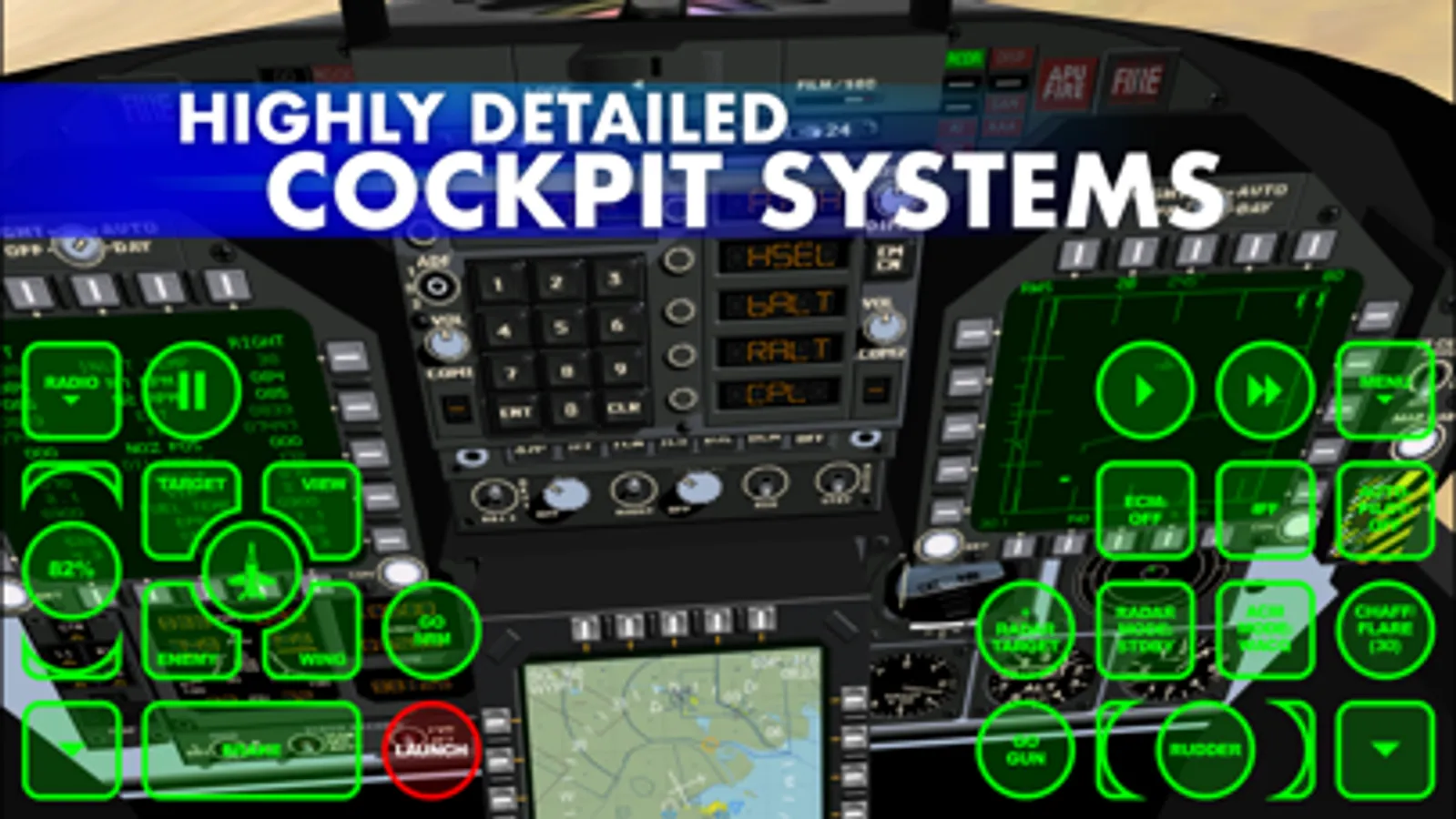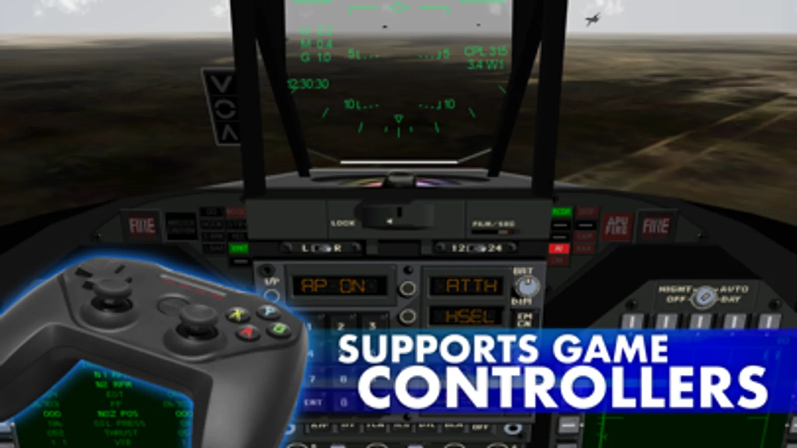 Interactive control overlays make it easy to use the extensive cockpit systems. It not only allows for input, but also provides feedback for aircraft systems such as radar mode or landing gear status. You control the aircraft's flight stick by rotating and tilting your device, or optionally using a compatible game controller.