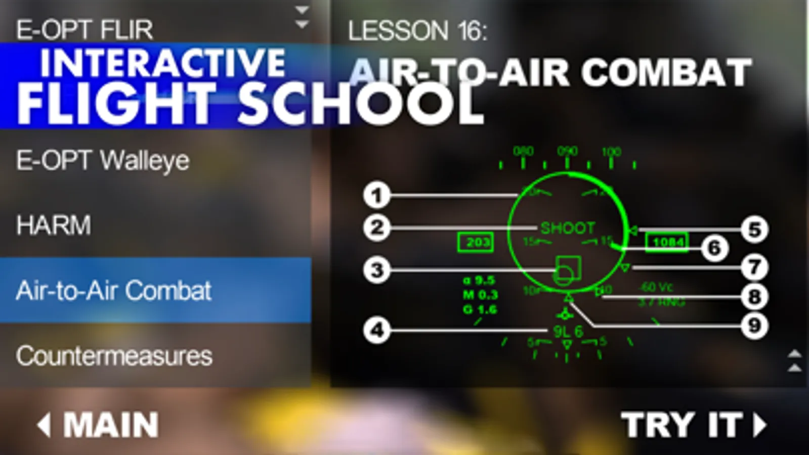 Acquire a target on the realistically simulated AN/APG-65 radar. Then launch an AIM-9 Sidewinder missile and watch it track its target with its realistically simulated guidance system.