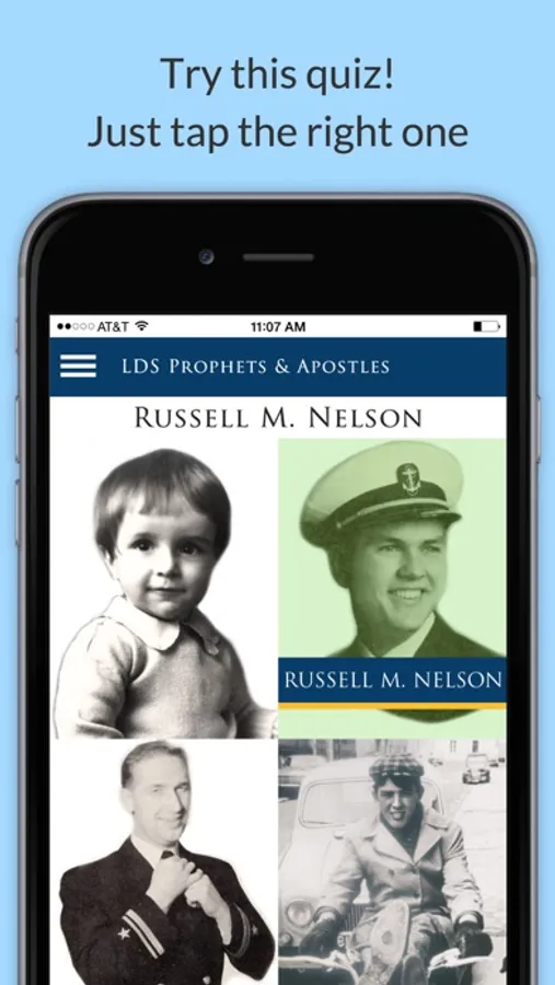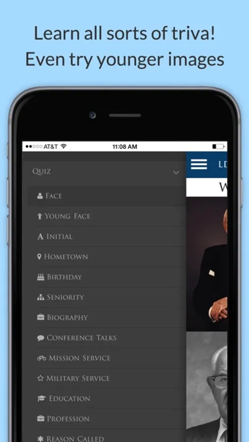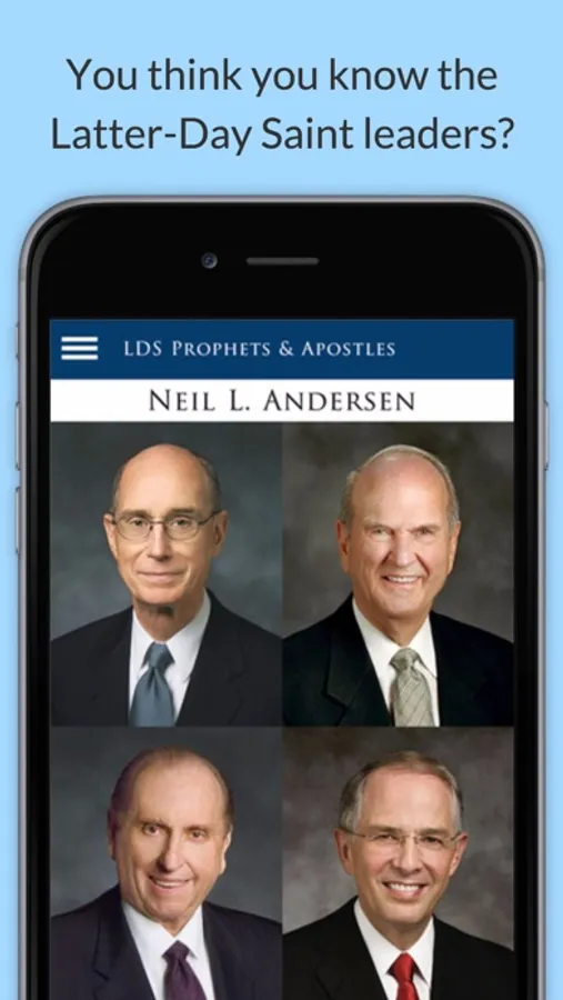 There are multiple groups to be quizzed on. Either select to be quizzed on current (living) apostles by selecting the apostles tab, or select the prophet mode and you will be quizzed on presidents of the church. There is also a study mode which will list all the current apostles along with their names followed by all the latter day prophets or presidents of the church.