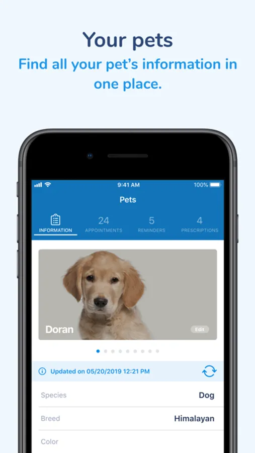 MyPetsWellness™ features unique technology which allows you to access your pet’s medical records, book real time appointments, get health certificates, and much more. You can even personalize MyPetsWellness™ with your own pet photos, all from your mobile device. You can see a map and directions to your veterinary office, or call, email and text them directly from your device. The MyPetsWellness™ app is connected to your pet’s records at your veterinary offices so it is always up to date. You can upload pictures, and send files using MyPetsWellness™ to inform your vet of your pet’s condition before your next visit.