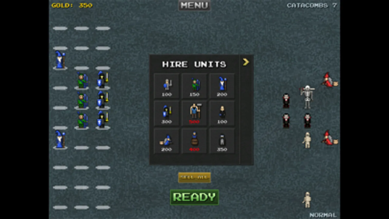Hire units and place them in strategic formations to counter the enemy army.
