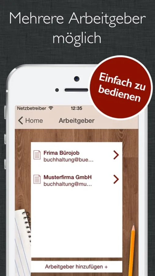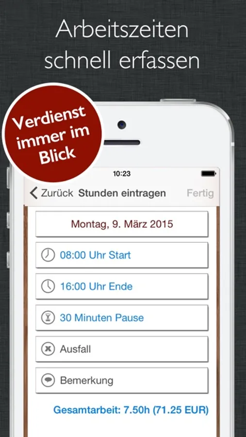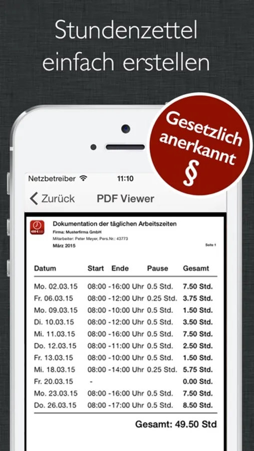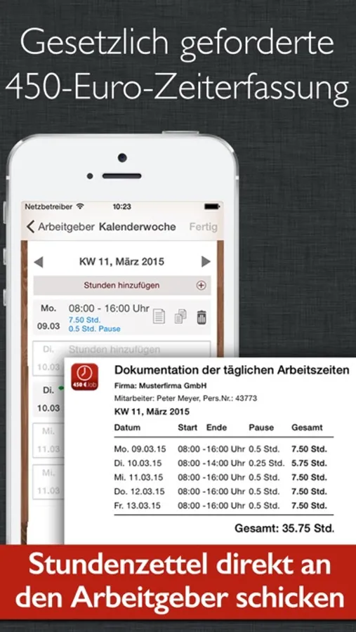 Die wöchentlichen Stundenlisten können direkt aus der App heraus an den Arbeitgeber verschickt werden. Alle gesetzlichen Vorschriften werden dabei eingehalten!
