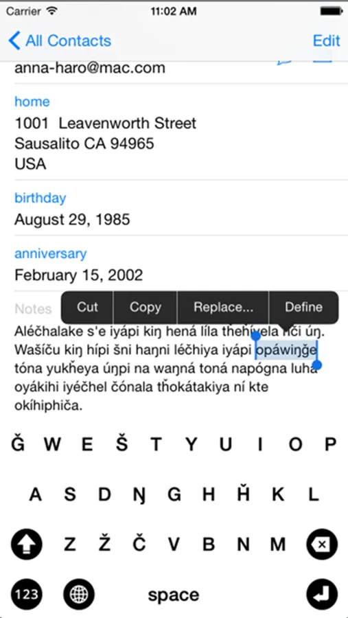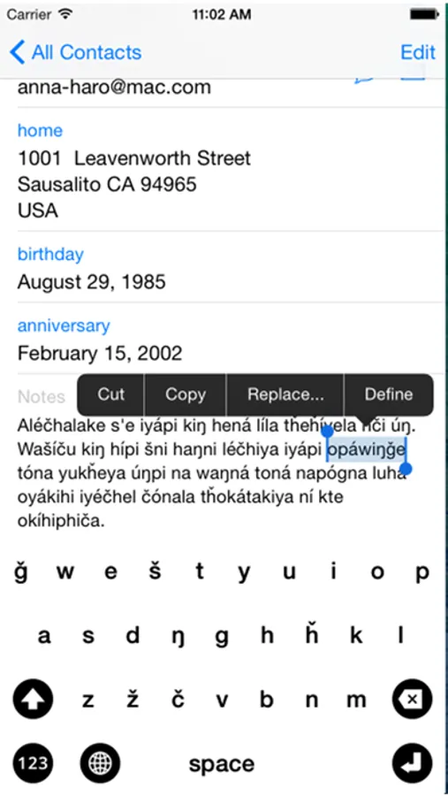 Once installed and selected as a keyboard option, you can switch between Lakota and English as you type emails, SMS, MMS, web content, and in any other text-input field. Simply press the GLOBE icon to switch.