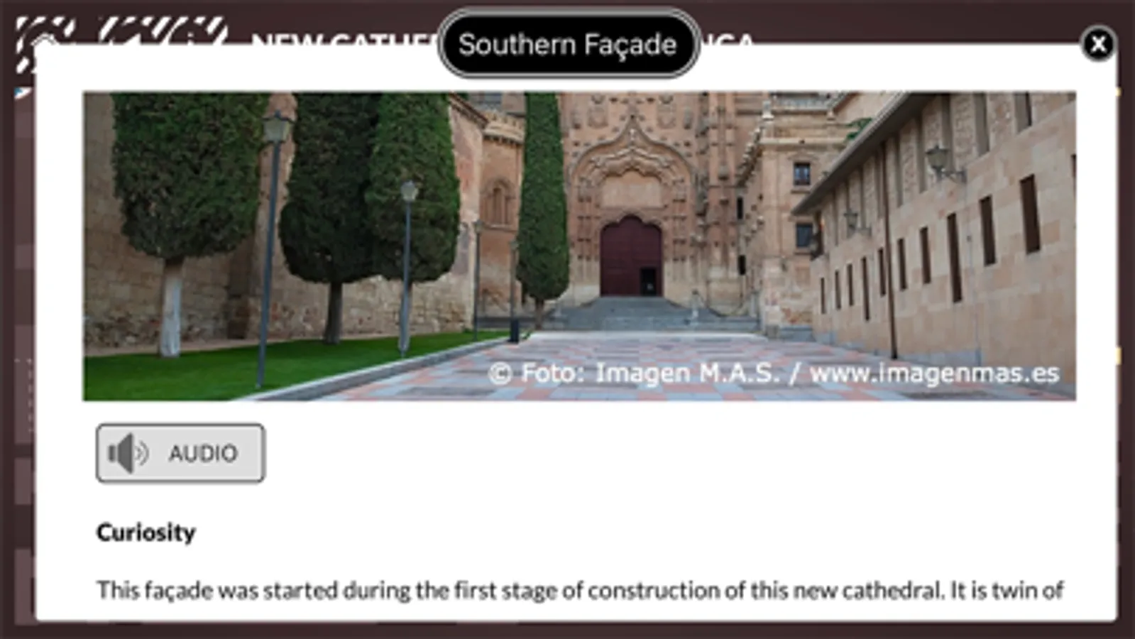 A handy guide and an audio app of the New Cathedral of Salamanca in a one device, your own phone!. Entertaining and intuitive, the only way to know each place and each chapel of the cathedral during your visit. You will also have a memory forever of what you've seen and it costs less than a cup of coffee.