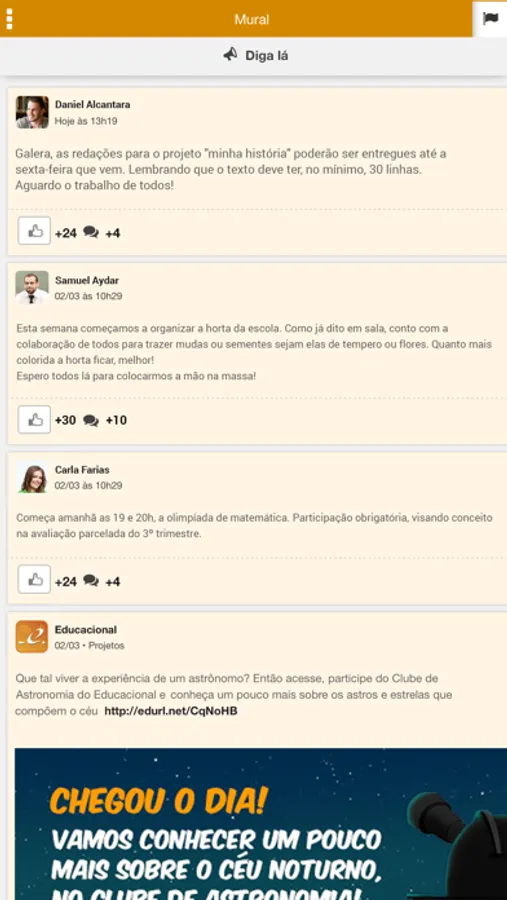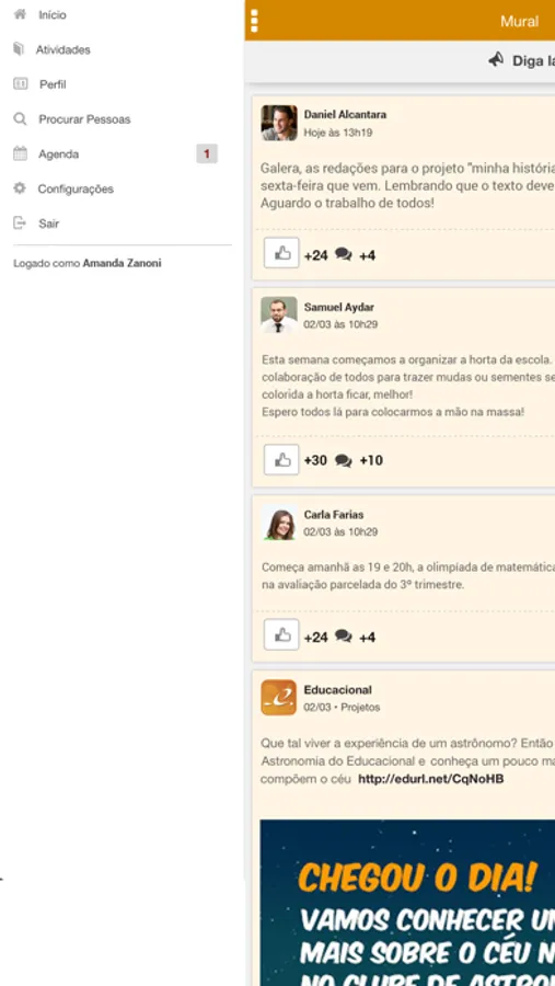 Por meio dele, é possível realizar postagens, assim como ver, curtir ou comentar postagens publicadas no mural, navegar pela lista de notificações, visualizar as atividades agendadas pelos professores, além de notícias relacionadas à escola e algumas informações institucionais.