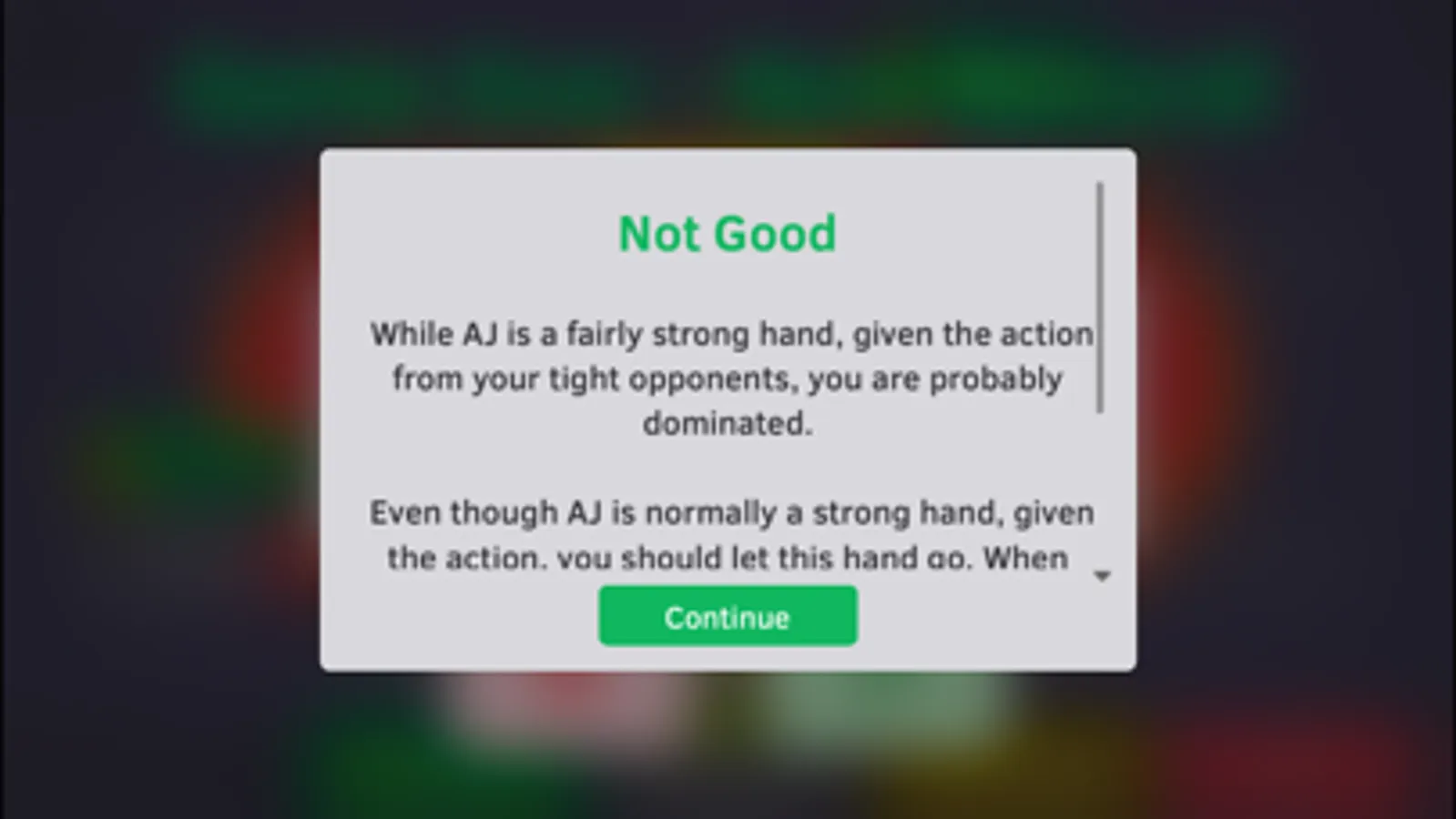 * You can optionally get explanations about each choice. All scenarios and explanations are backed by the WPT Season VI Player of the year, Jonathan Little.